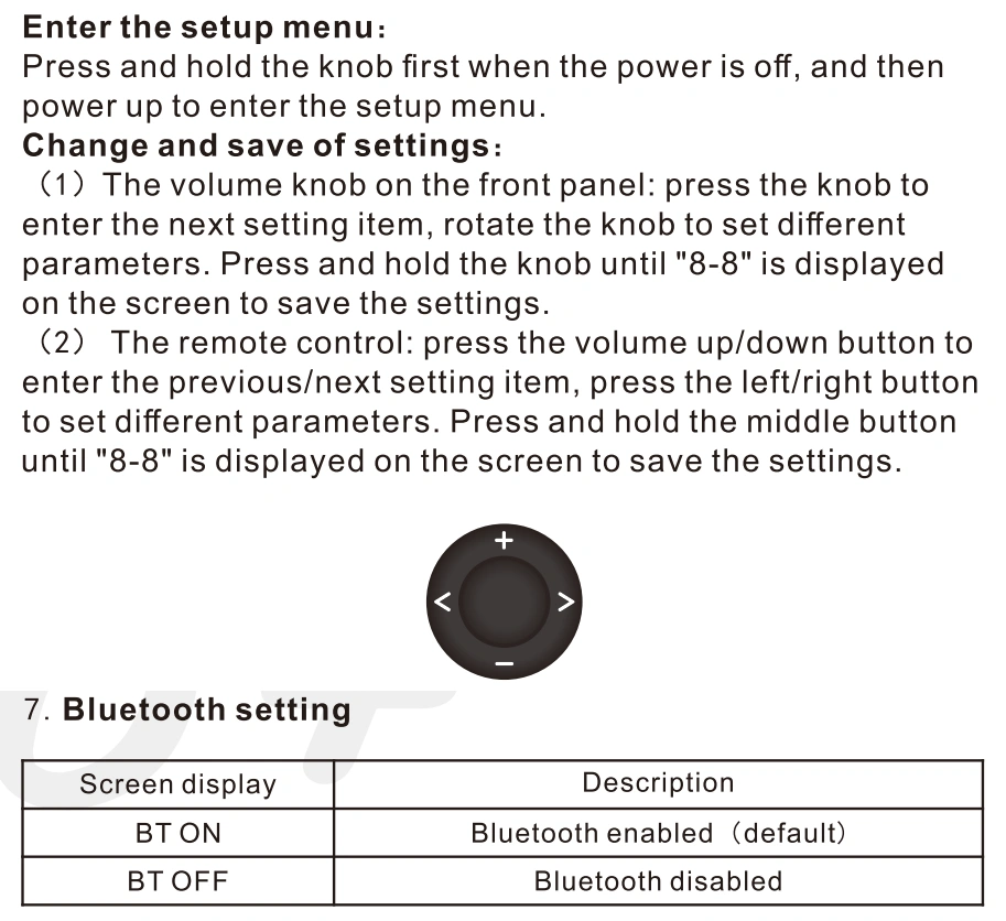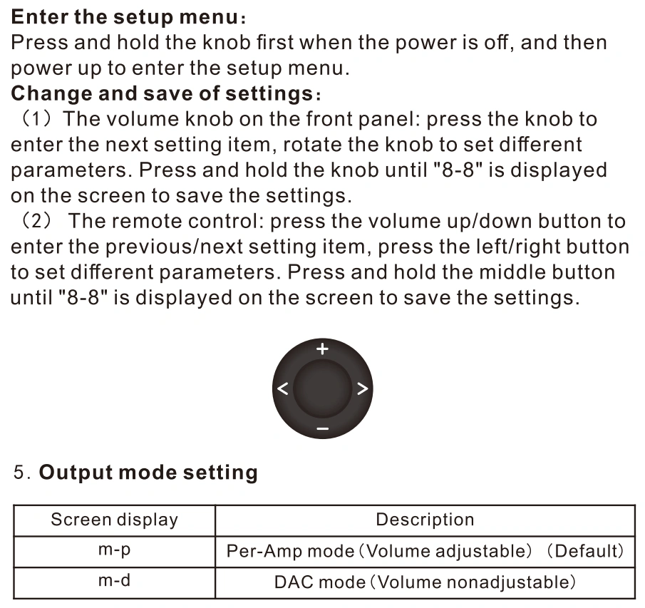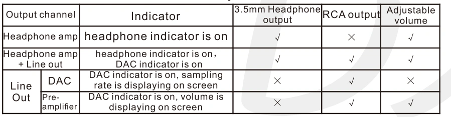 · In PRE (Pre-amplifier) mode, the this unit will always display the volume level. When the sampling rate of the input signal changes, it will display the sampling rate for 2 seconds and then continue displaying the volume level; In DAC mode, it will always display the sampling rate, keep the maximum volume output and the volume is not adjustable.